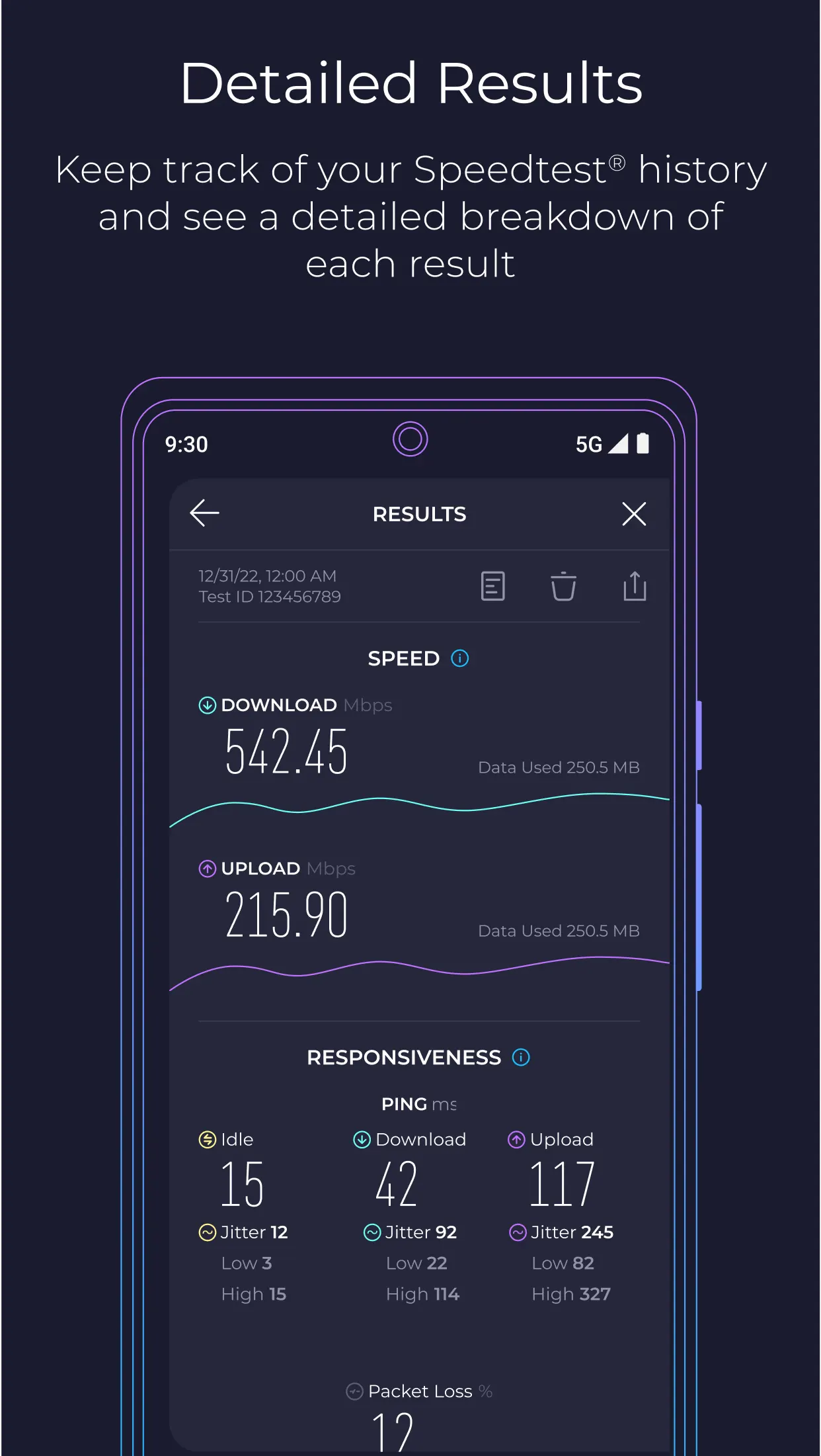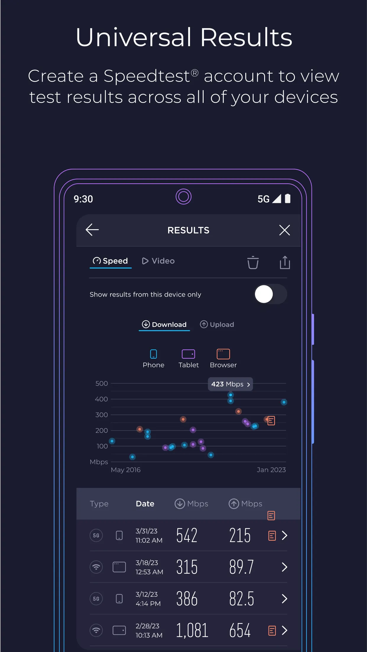 Results are presented instantly and stored in a history, making it easy to compare different networks, locations or time periods.